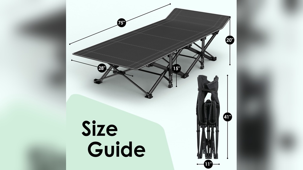 Camping cots come in different lengths and widths. Most standard cots are about 72 inches long and 25 inches wide. This size fits most people comfortably. Taller campers should check the cot length carefully to avoid feet hanging off the edge. Wider cots offer more space to move but add weight and bulk. Pick a size that balances comfort and portability.